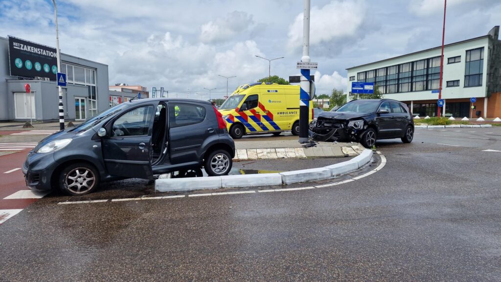 Mogelijk is geen voorrang verlenen de oorzaak van de botsing. Door de aanrijding is een auto tot stilstand gekomen tegen een lantaarnpaal. De andere auto is doorgeschoten over de middenberm.