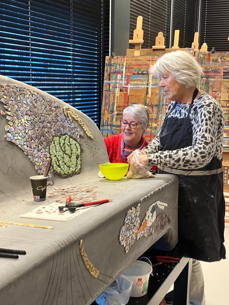 Onder leiding van docent Margret Schilder hebben Felina, Hamza, Sam en Justin, leerlingen van Praktijkschool Focus, de eerste Social Sofa ontworpen. De bankzitters zullen elementen uit het nieuwe wapen van Dijk en Waard ontdekken: o.a. reigers, een koolvlet, kolenveld en graan. Nadat de organisatie van Social-Sofa de mozaïekstenen in de juiste kleuren had voorbereid, kon een team van vrijwilligers – Anita, Carla, Connie, Els, Annette, Karin, Margot, Liesbeth, Rina, Conny onder aanvoering van Yvonne de Looze in het Atelier van Cool kunst en cultuur aan de slag om de duizenden stenen in het juiste patroon in te leggen. ,,Niet alleen de bank op het Coolplein zorgt voor sociale verbinding, ook het maakproces. Want het was reuzegezellig de afgelopen maanden op de dinsdag- en vrijdagochtend in het Atelier”, vervolgt De Koning. ,,Na de zomer gaat het team een Social Sofa voor Langedijk maken. Hiervoor hebben leerlingen van Jan Arentsz een kleurrijk ontwerp gemaakt.” De realisatie van de sofa’s is mede mogelijk gemaakt door een bijdrage uit het Start Dijk en Waard Fonds van de gemeente.
