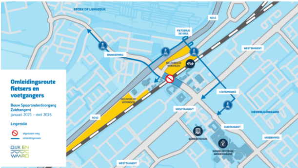 In januari 2025 start de bouw van de spooronderdoorgang in de Zuidtangent, als onderdeel van het project Stationsgebied Dijk en Waard Fase 1. Dit project, goedgekeurd door de gemeenteraad op 19 september 2023, zal de bereikbaarheid en veiligheid in het Stationskwartier verbeteren. De spoorovergang in de Zuidtangent wordt vanaf 6 januari tijdelijk afgesloten, wat tot verkeersaanpassingen leidt in de regio. Het college informeert inwoners en bedrijven over de omleidingsroutes en mogelijke verkeersdrukte.